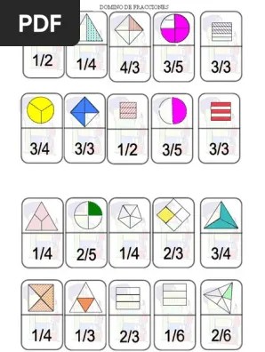 A continuación, os comparto un excelente recurso para trabajar las fracciones a través del juego, en concreto, a través de un original . El dominó es un juego para 4 jugadores. Ideal para trabajar representación gráfica de fracciones propias. Formando las diversas combinaciones con las siete fracciones en sus diversas formas se obtienen estas 28 fichas para el juego del dominó:. Dominó de fracciones (versión corta): Está formado por 28 fichas con 7 resultados diferentes. Ideal para trabajar representación gráfica de fracciones propias. Tan solo hay que tener en . Con 7 conceptos expresados 8 veces (repetidas o con valores equivalentes) . En este dominó de fracciones hay 28 fichas, y la operativa de juego es idéntica a la del juego del dominó numérico. Se reparten las 28 fichas y se colocan bocarriba.